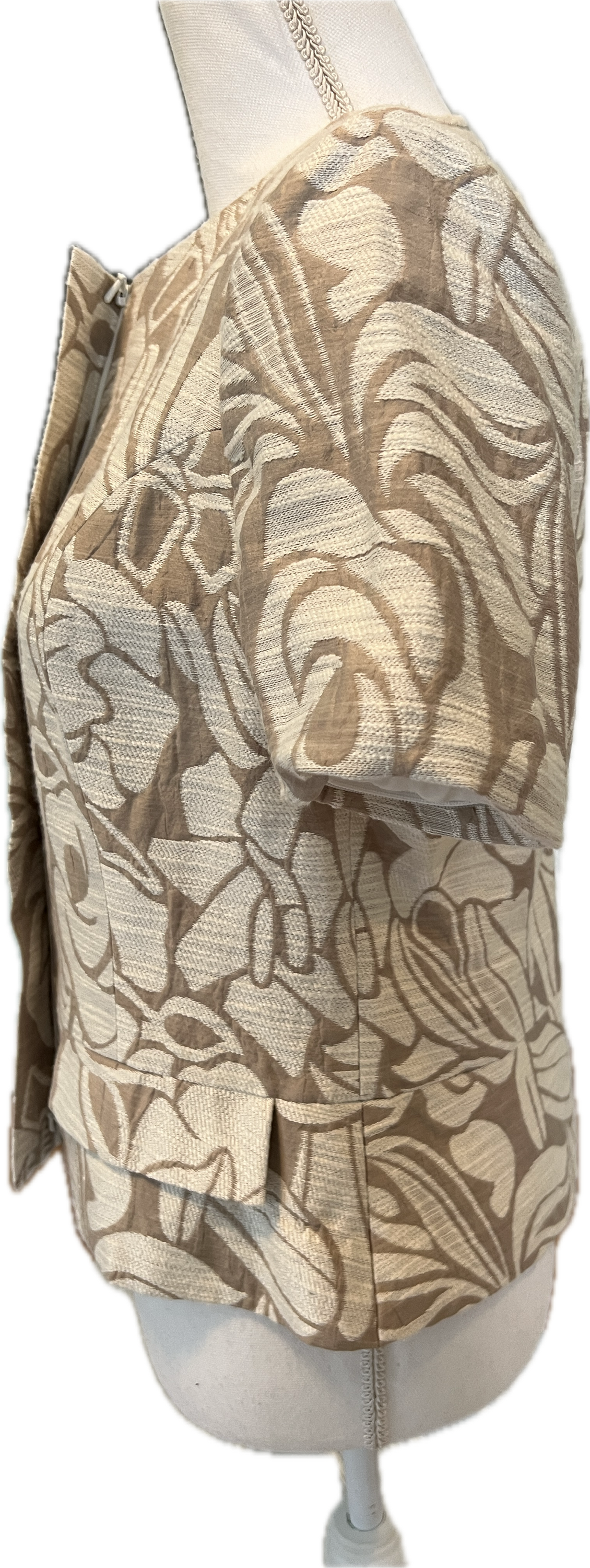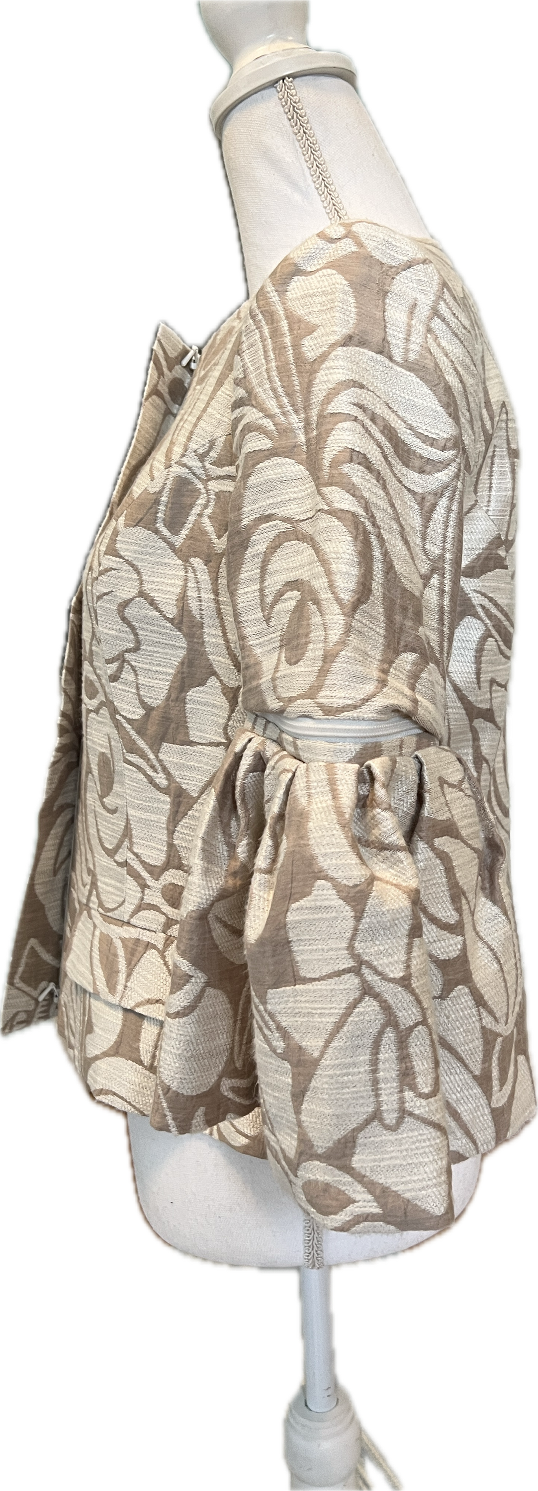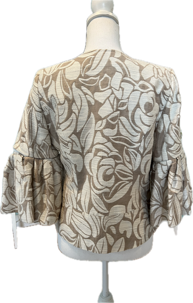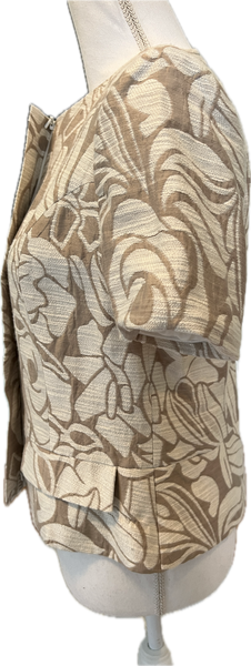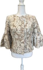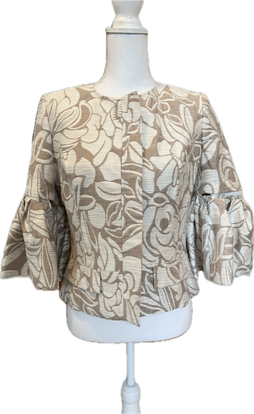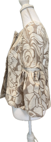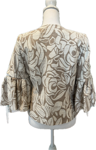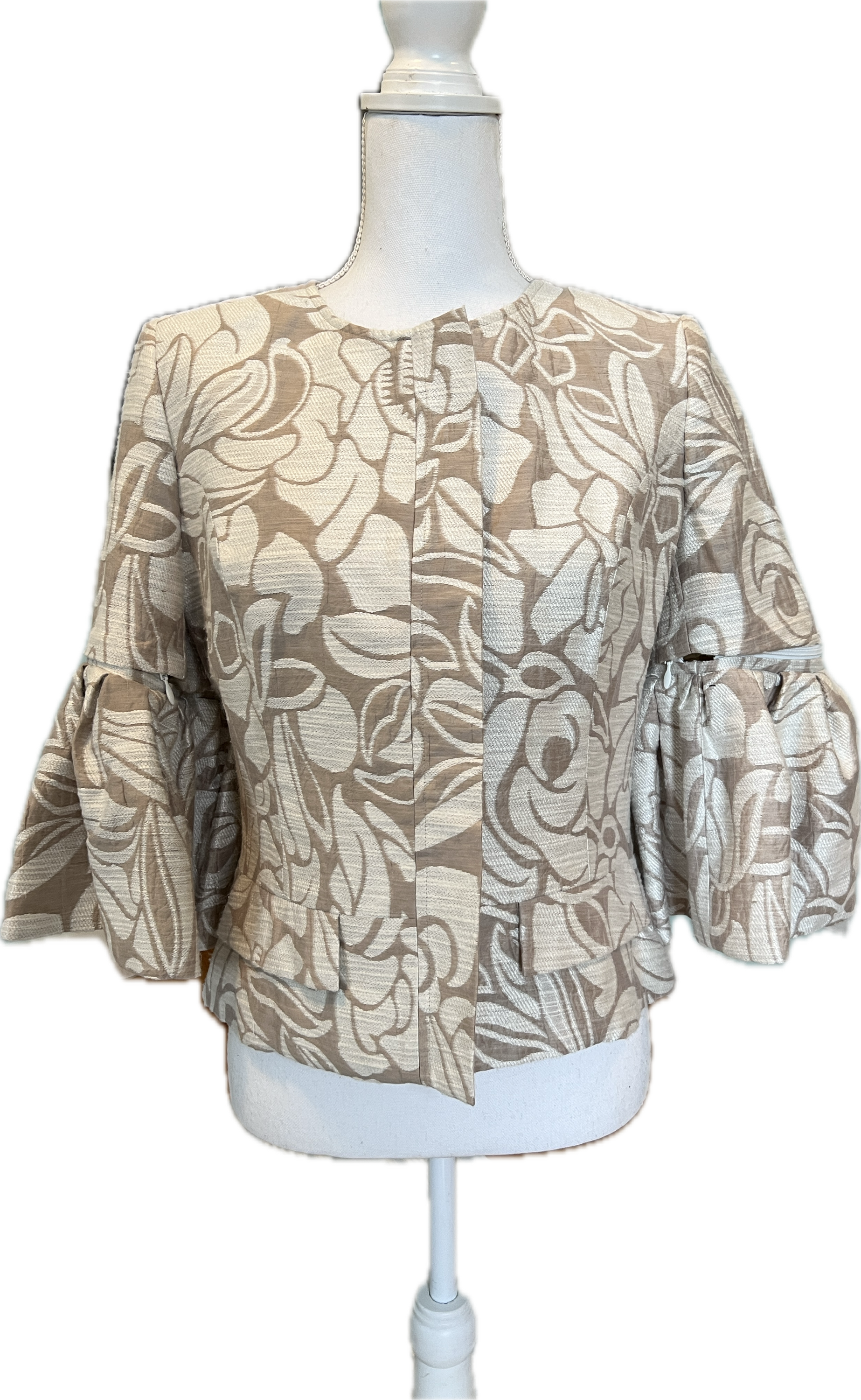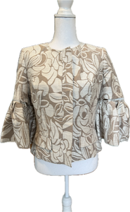 Interesting neutral (taupe-ish?) floral print jacket with removable bell sleeves. The first picture shows where the zipper is (for the picture only-zipper doesn't show otherwise). The last picture shows the sleeves removed. Lined and two front faux flap pockets. Excellent used condition.