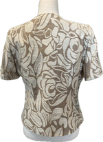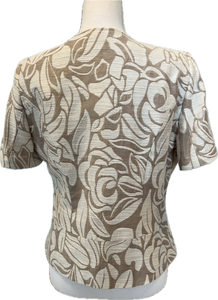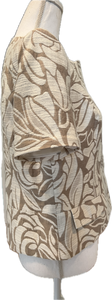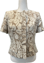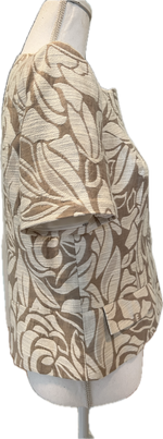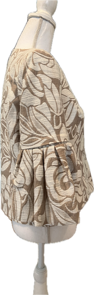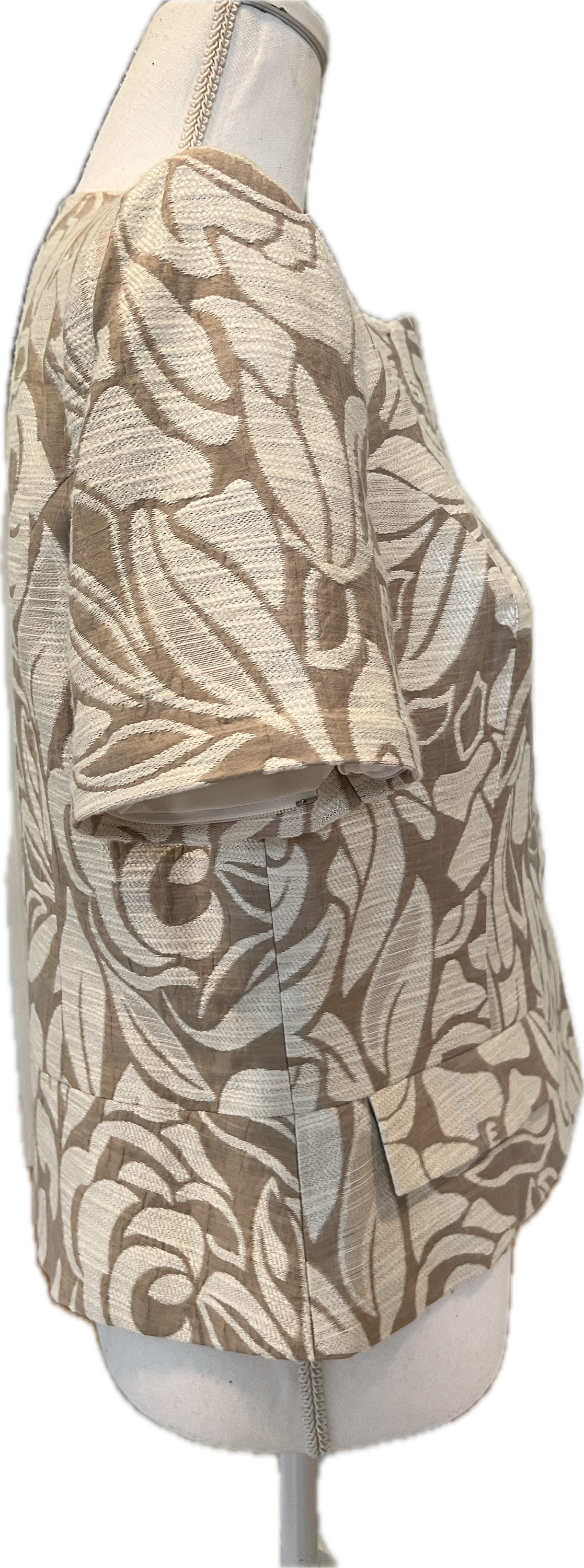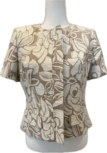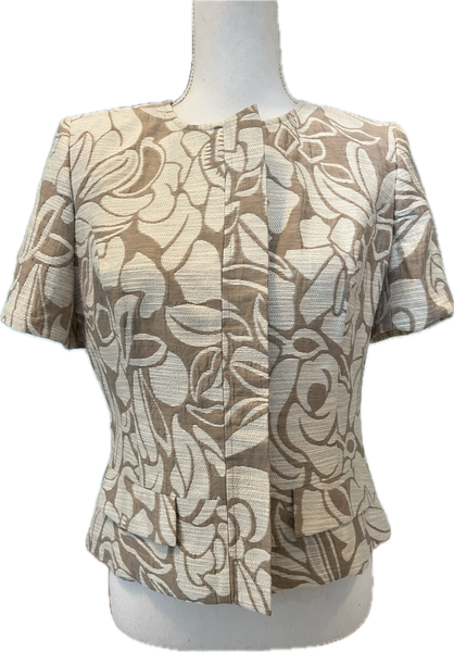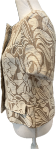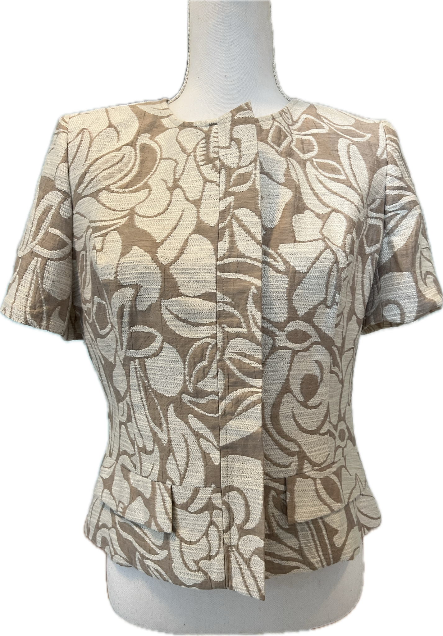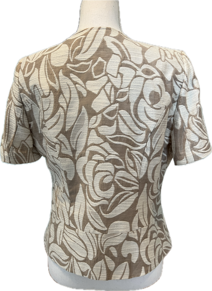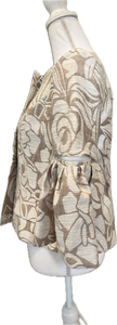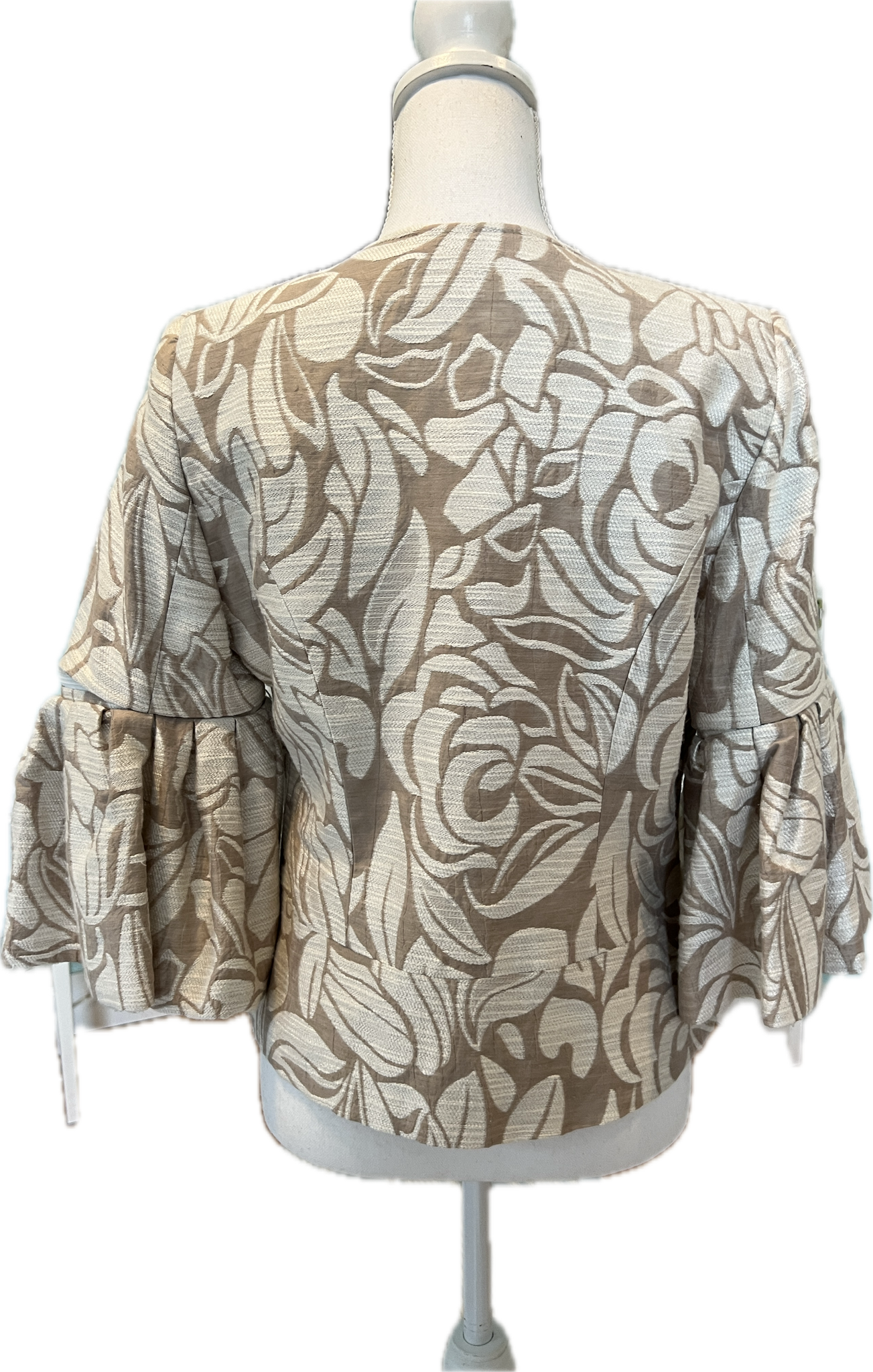 Interesting neutral (taupe-ish?) floral print jacket with removable bell sleeves. The first picture shows where the zipper is (for the picture only-zipper doesn't show otherwise). The last picture shows the sleeves removed. Lined and two front faux flap pockets. Excellent used condition.