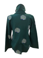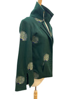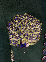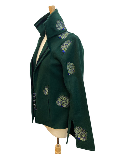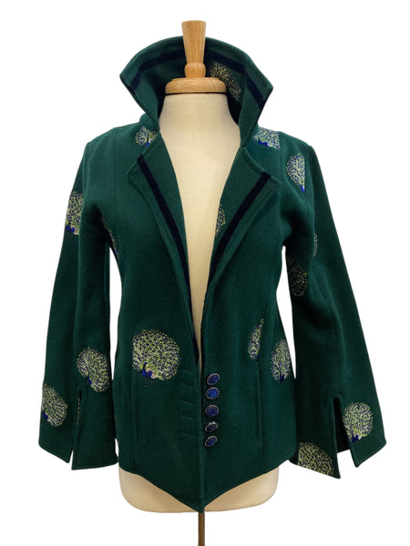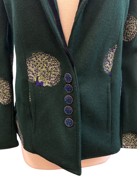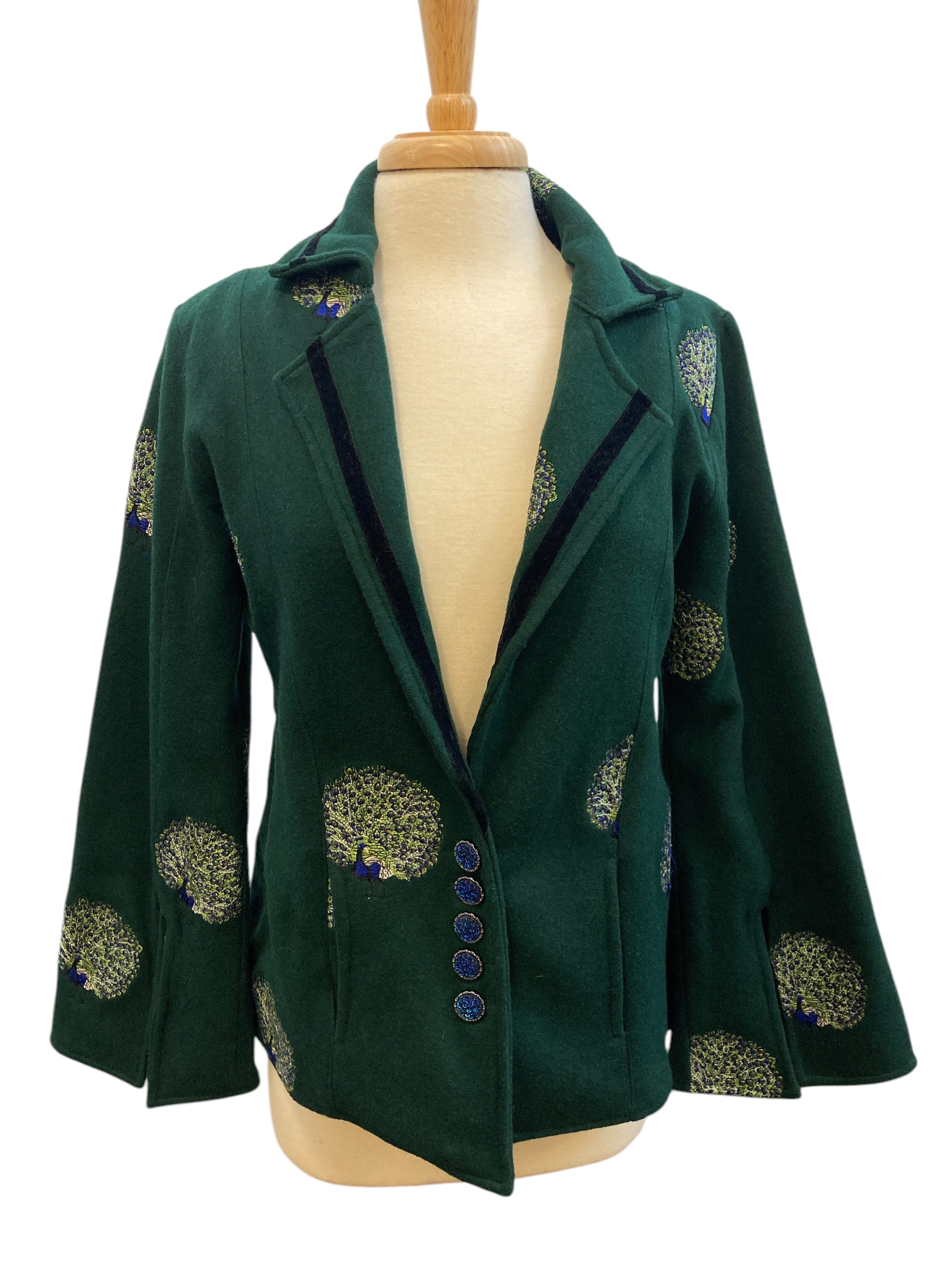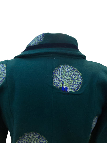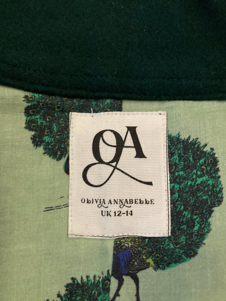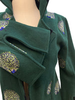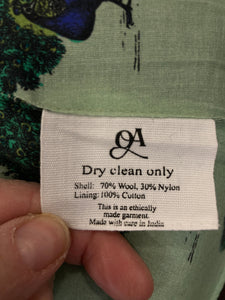 We get the coolest donations! This is one from the designer Olivia Annabelle of the UK. Green with dancing peacocks and black velvet trim, it is inspired by the coat worn by Dorian Gray in the novel. Extraordinary buttons and split cuffs that show off cotton peacock lining. Two front pockets (very small). Excellent used condition.