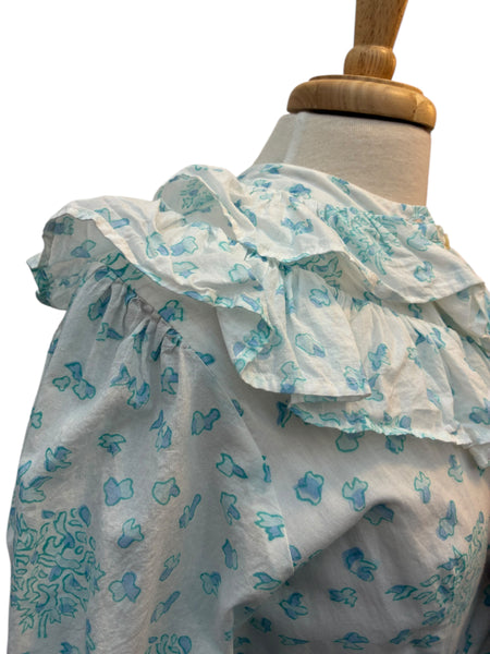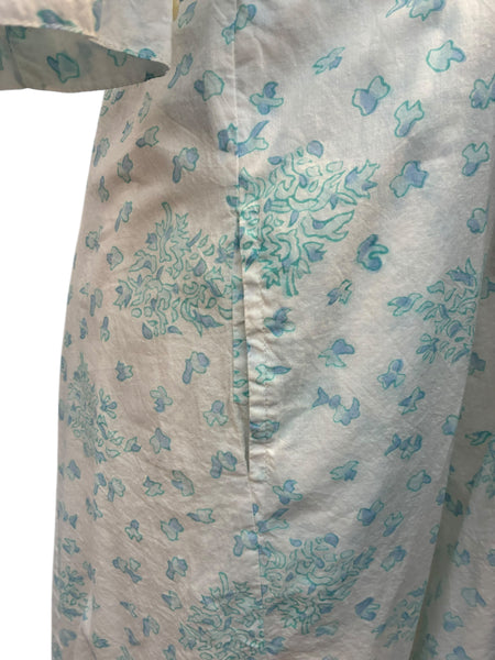 Breezy cotton dress with pockets, ruffle collar, and buttons down the front in a hidden placket. Lined. Excellent used condition.