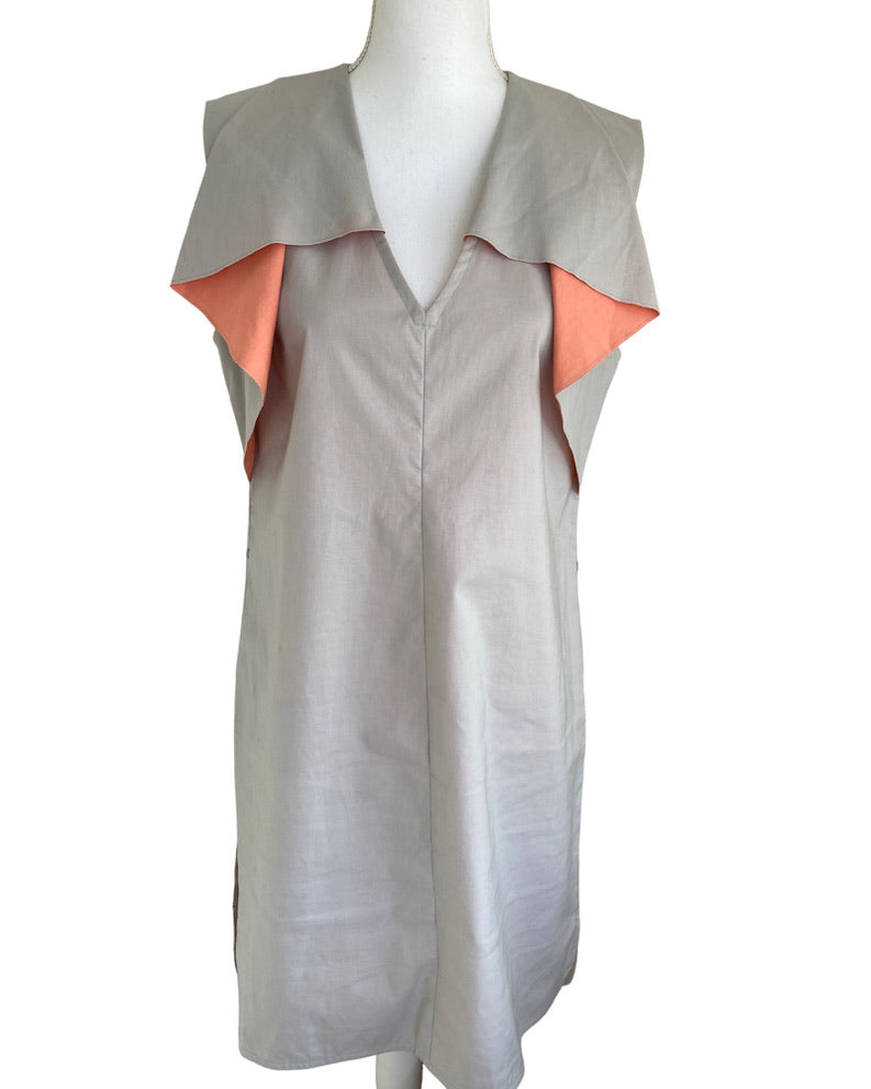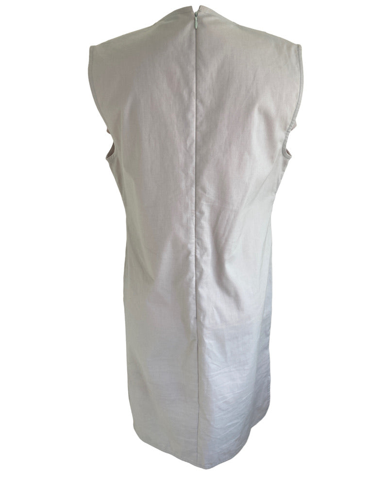 Cotton shift with ruffle. There are tiny belt loops but there is no belt. Very good used condition-water mark on shoulder, minor stain at hem.