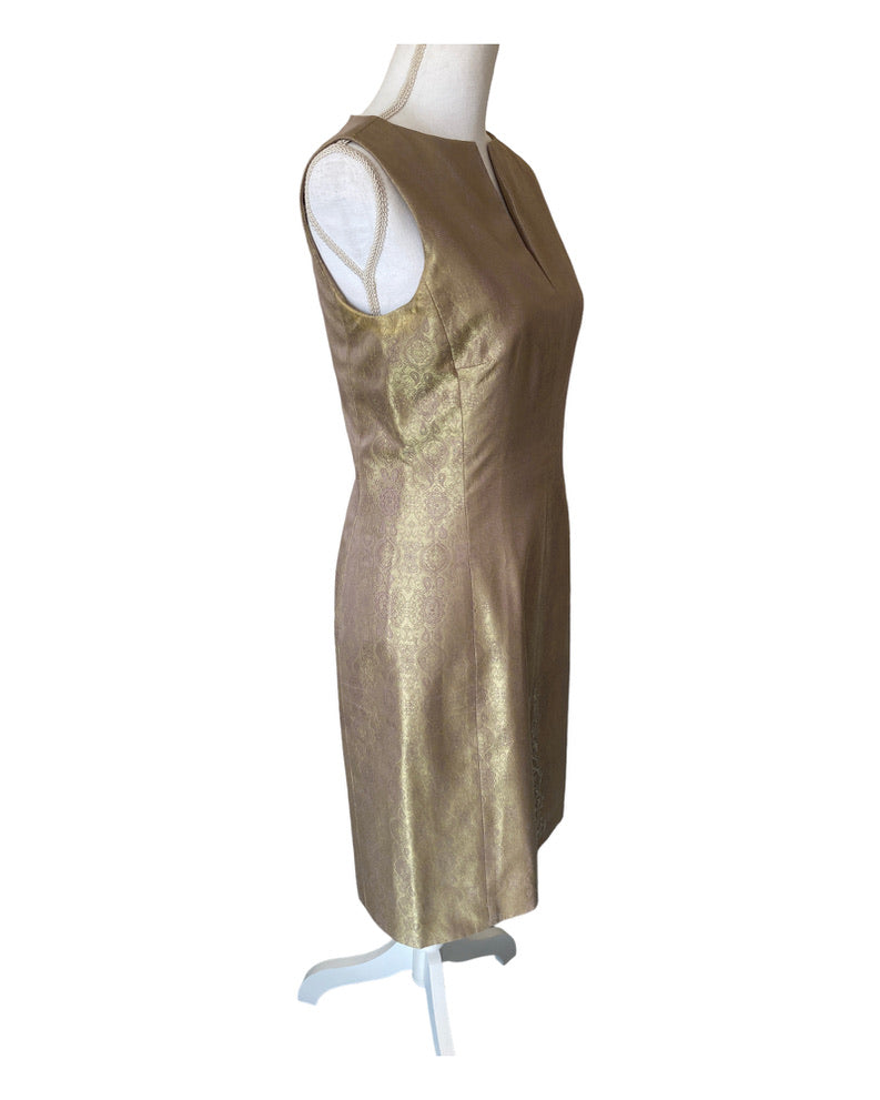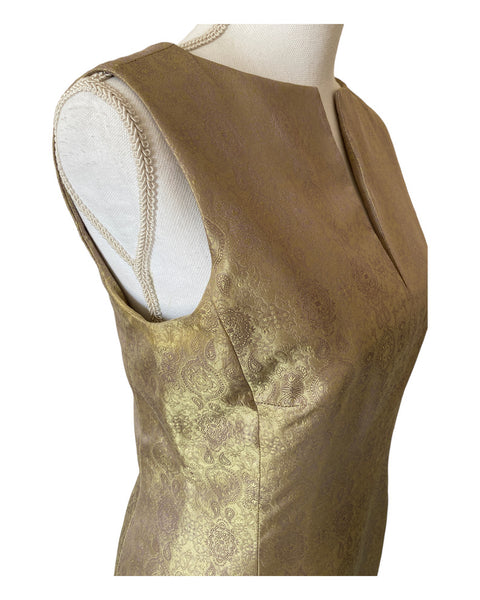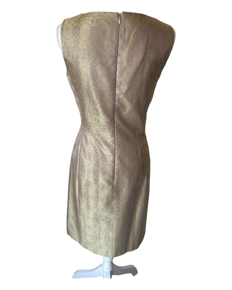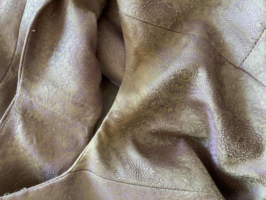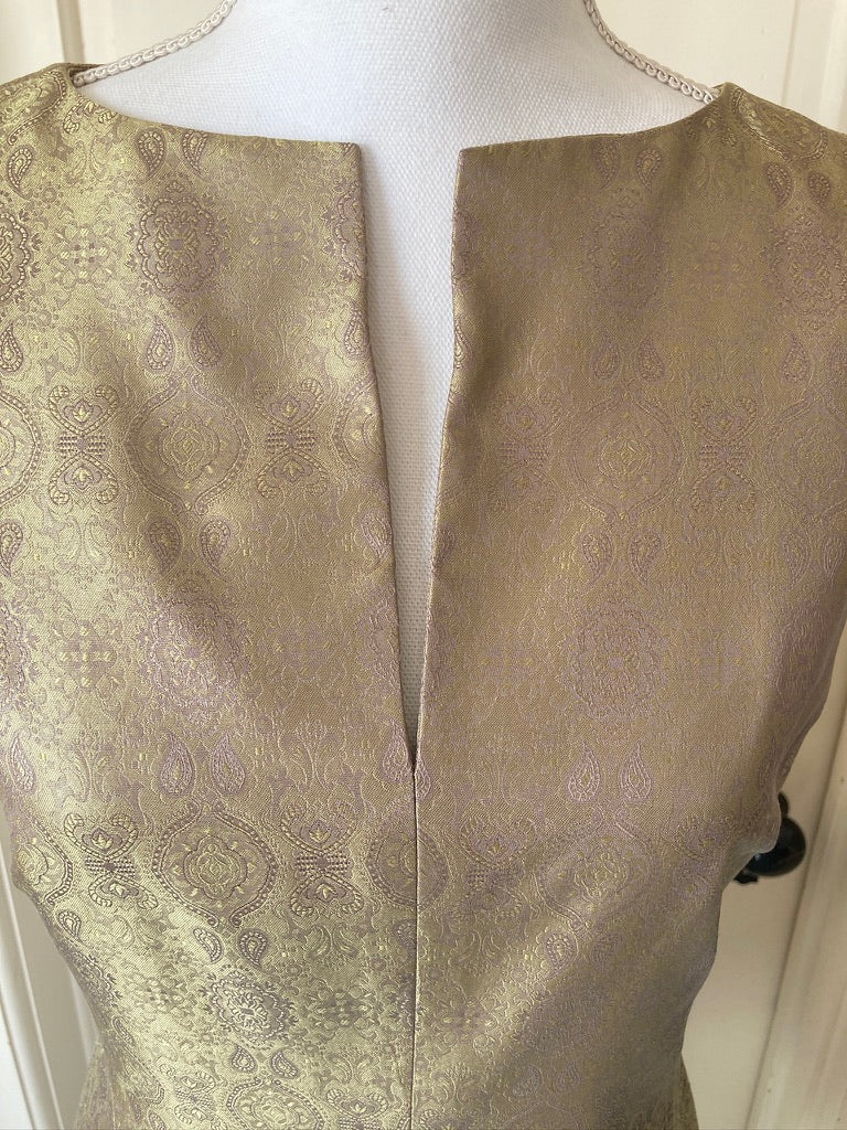 This is a beautiful dress in good condition. There are light underarm stains, or fabric that is a little lighter, under the arms. It is not super noticeable, as the fabric is sort of gilded jacquard. See the pictures below. There is lovely embroidery on front slit. Zipper up the back.