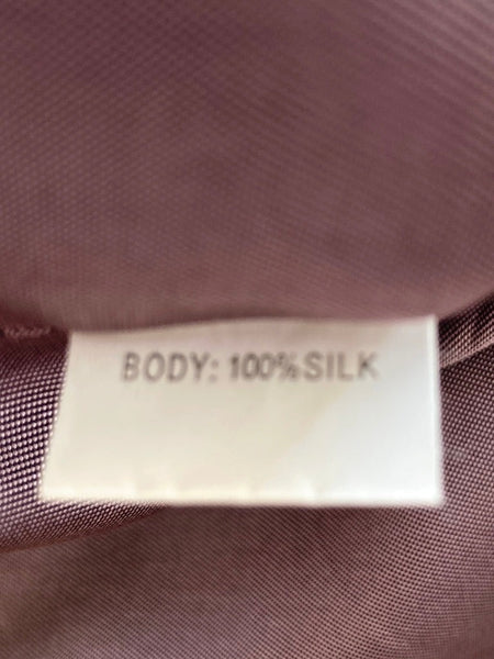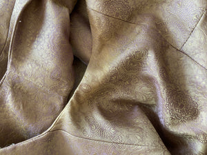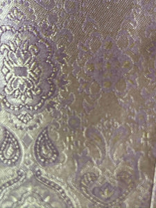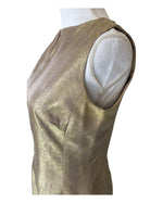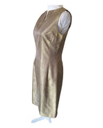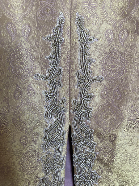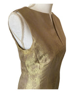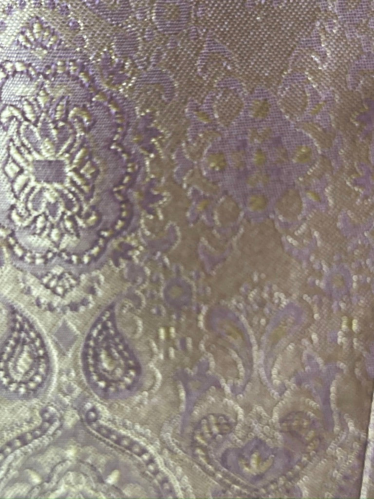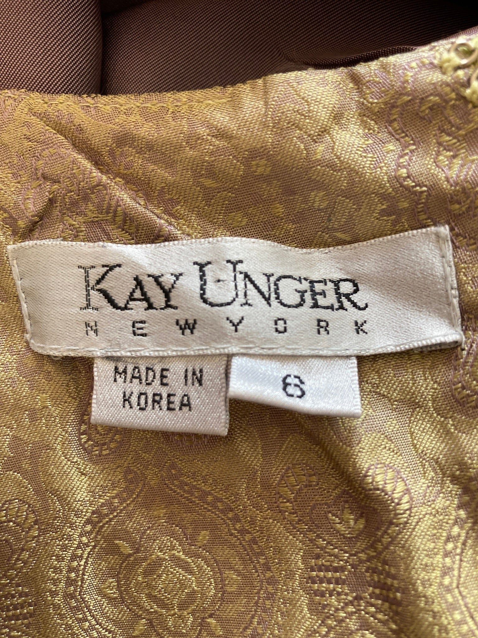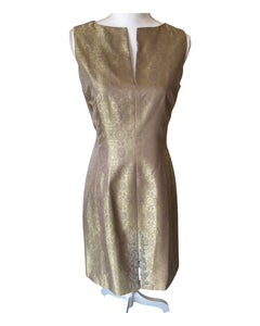 This is a beautiful dress in good condition. There are light underarm stains, or fabric that is a little lighter, under the arms. It is not super noticeable, as the fabric is sort of gilded jacquard. See the pictures below. There is lovely embroidery on front slit. Zipper up the back.