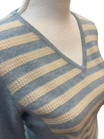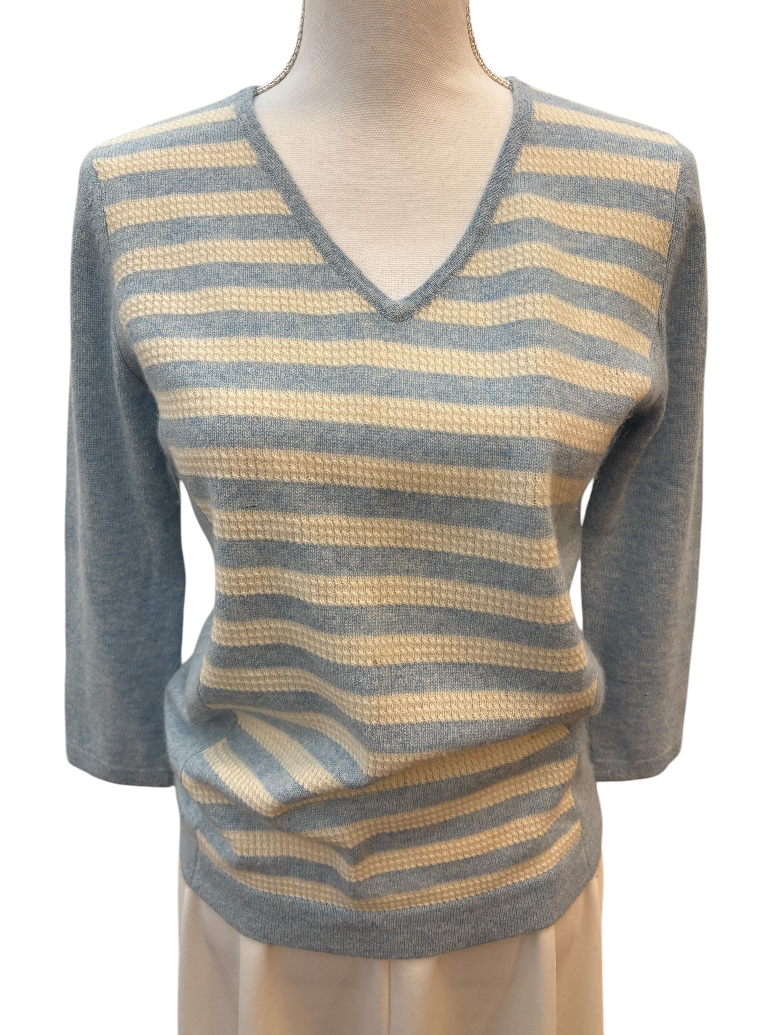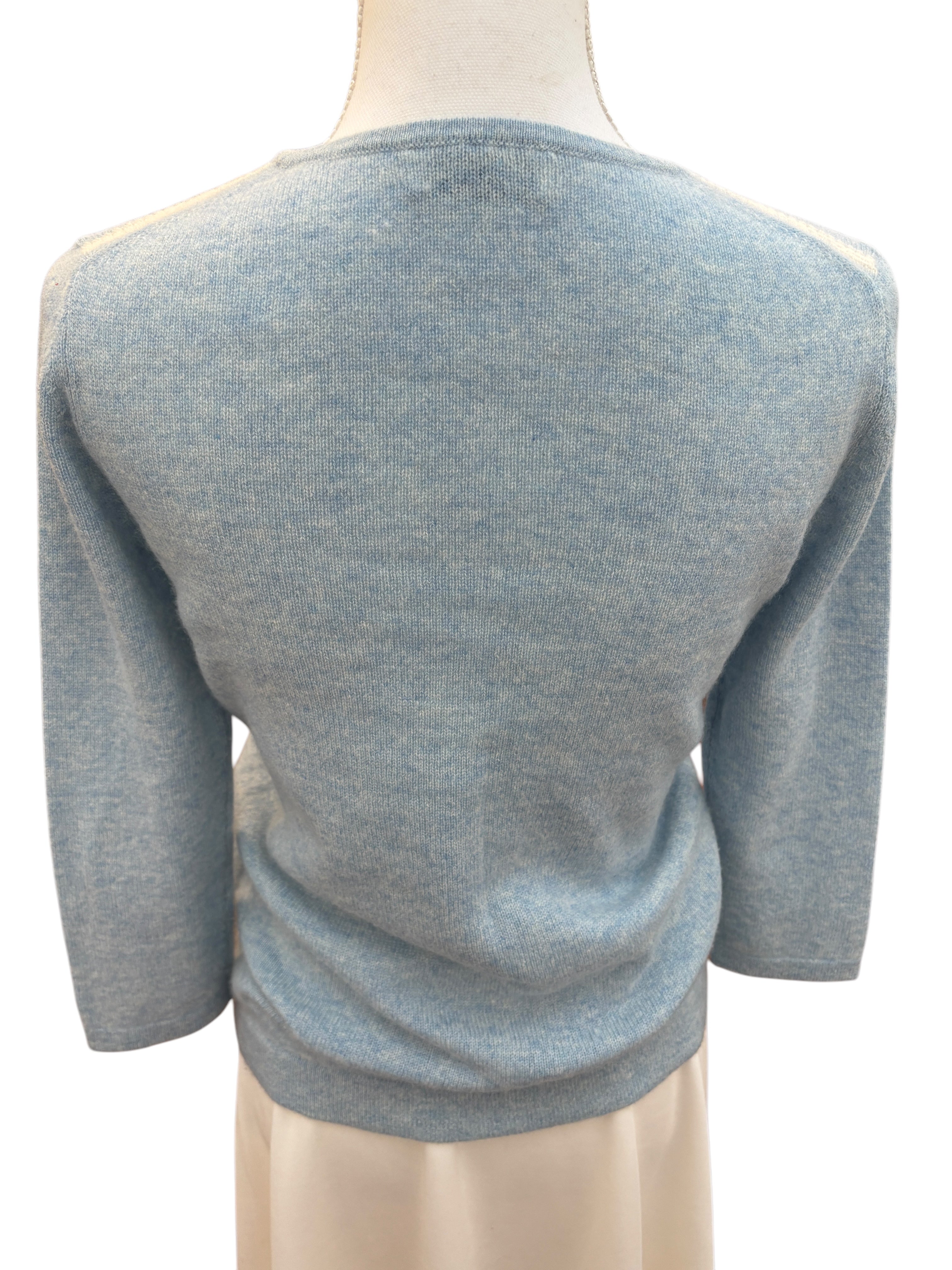 Three quarter sleeves on this soft sweater. There is a single discolored thread, please see the last picture, that is only visible up close. Excellent used condition.