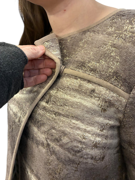 Jenny from Gossip Girl? Feeling those vibes with this one. Asymmetrical closure with two buttons at the top only, which means the hem at the bottom is loose. Lined and 3/4 sleeves. Excellent preowned condition.