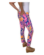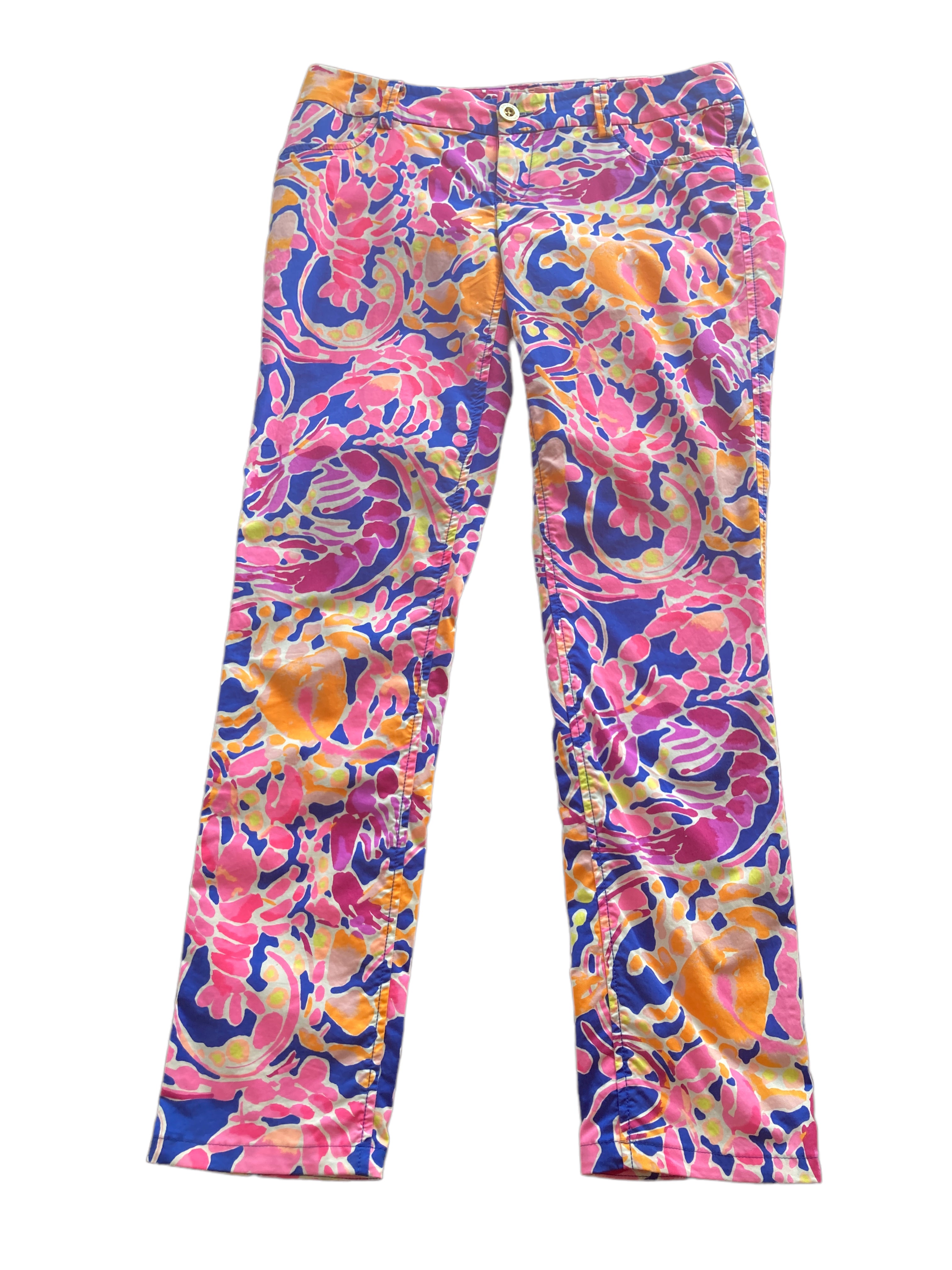 Pink lobsters and purple shrimp orange crabs on a blue background. Low rise with a big gold button, front pockets, back slit pockets, belt loops. Excellent used condition