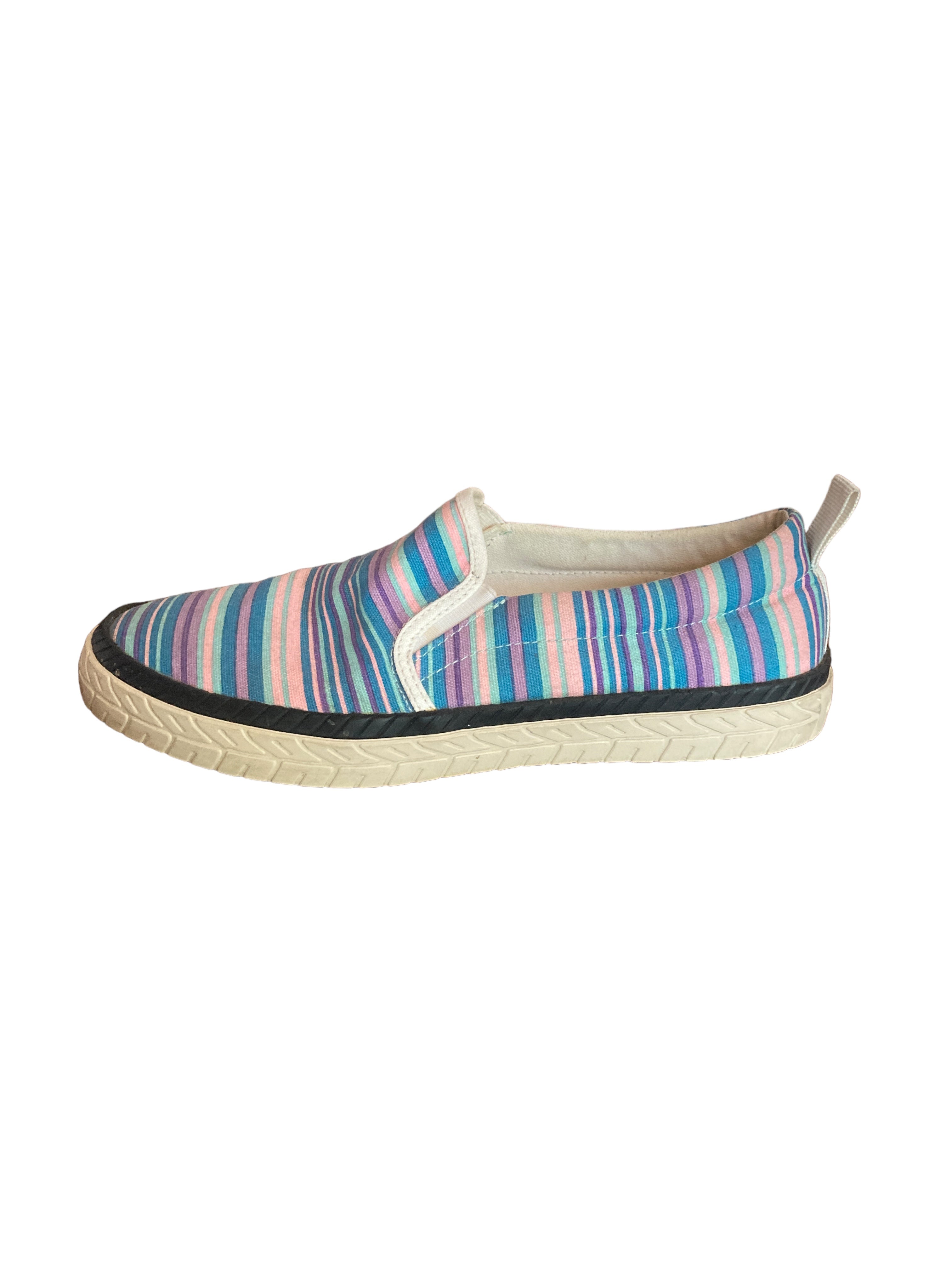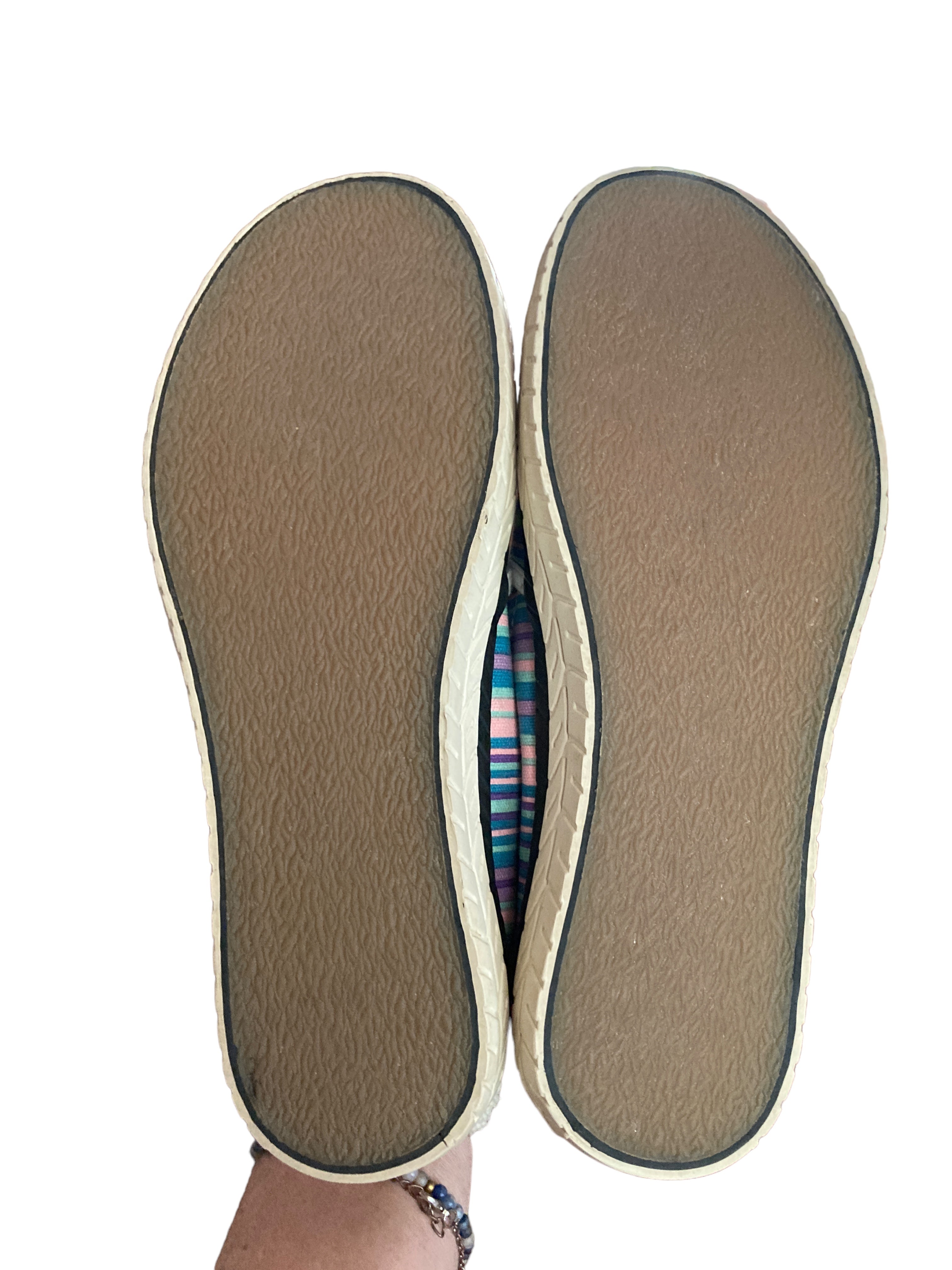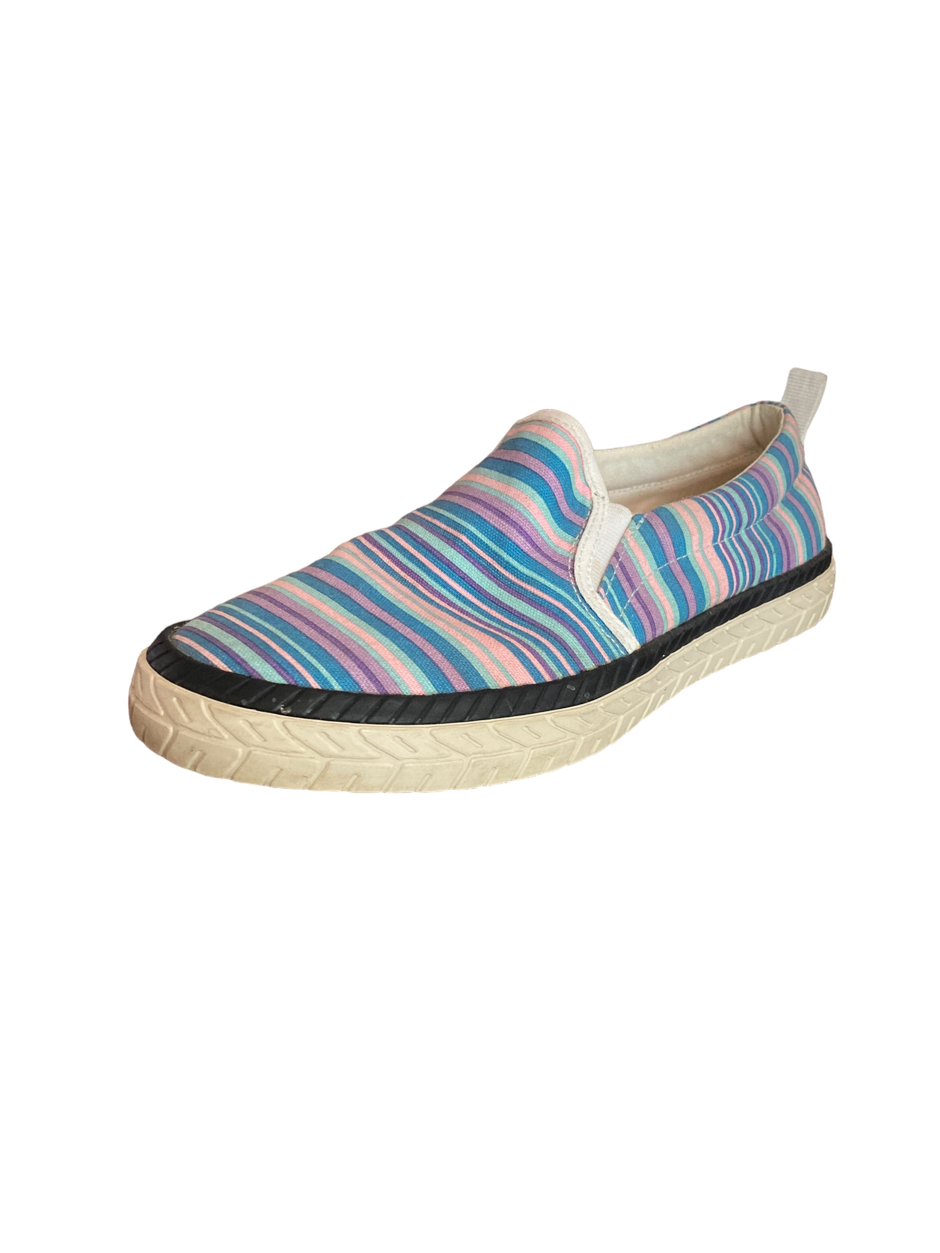These comfy sneaks fit like a size 9. Rubber soles in very good condition-dark marks on the inside in the toe box at the top of the shoe, light fading on canvas.