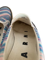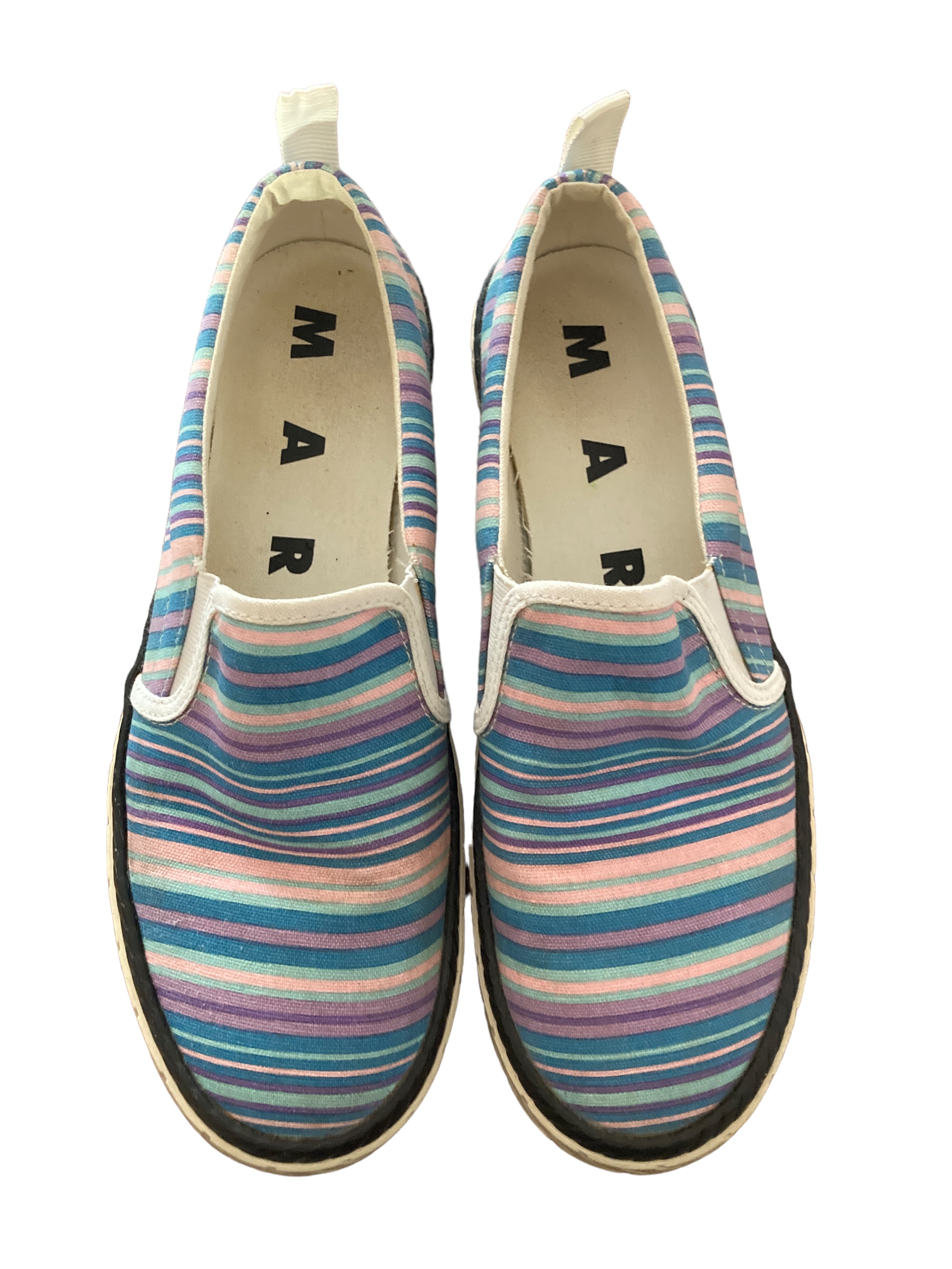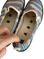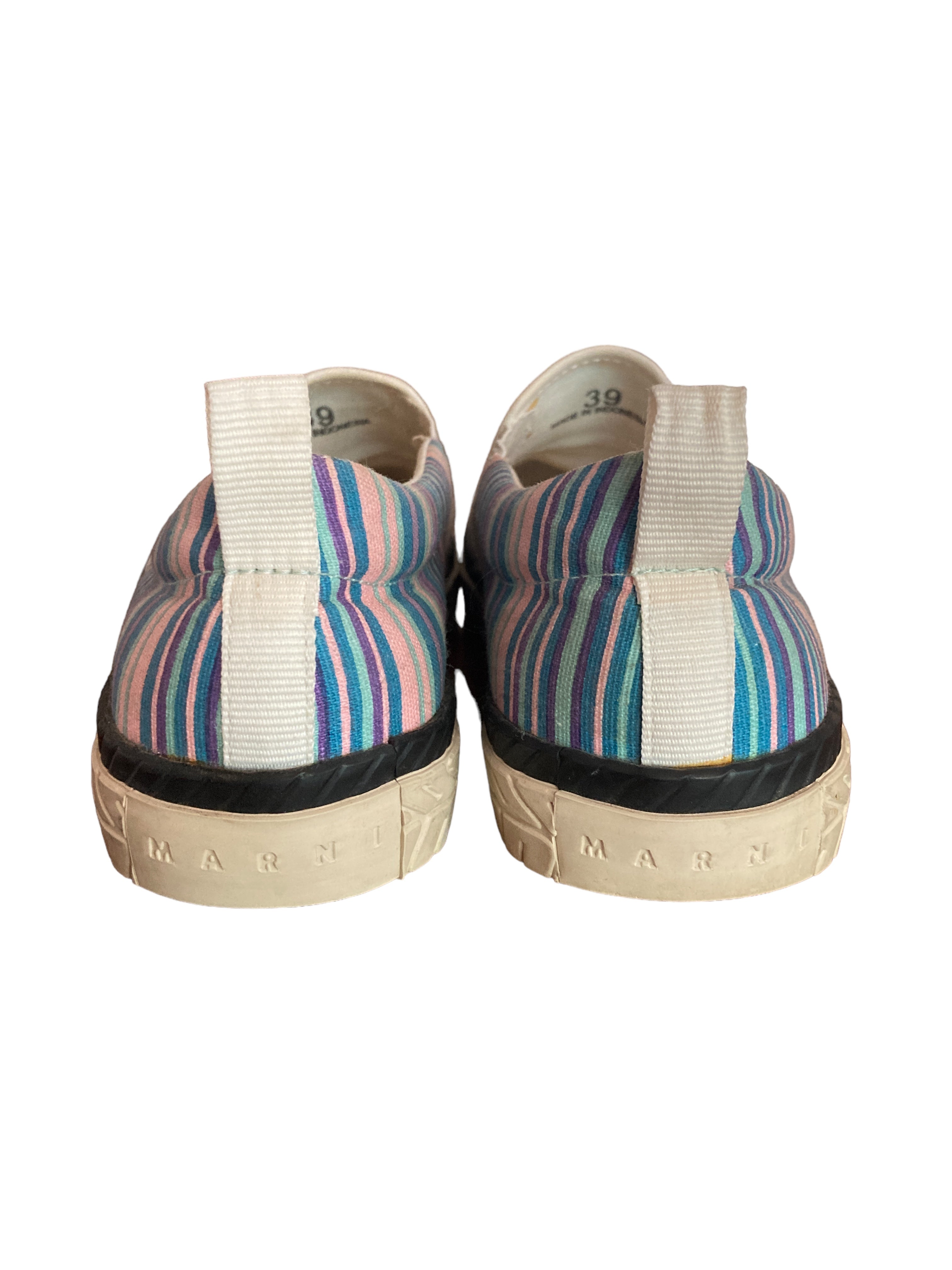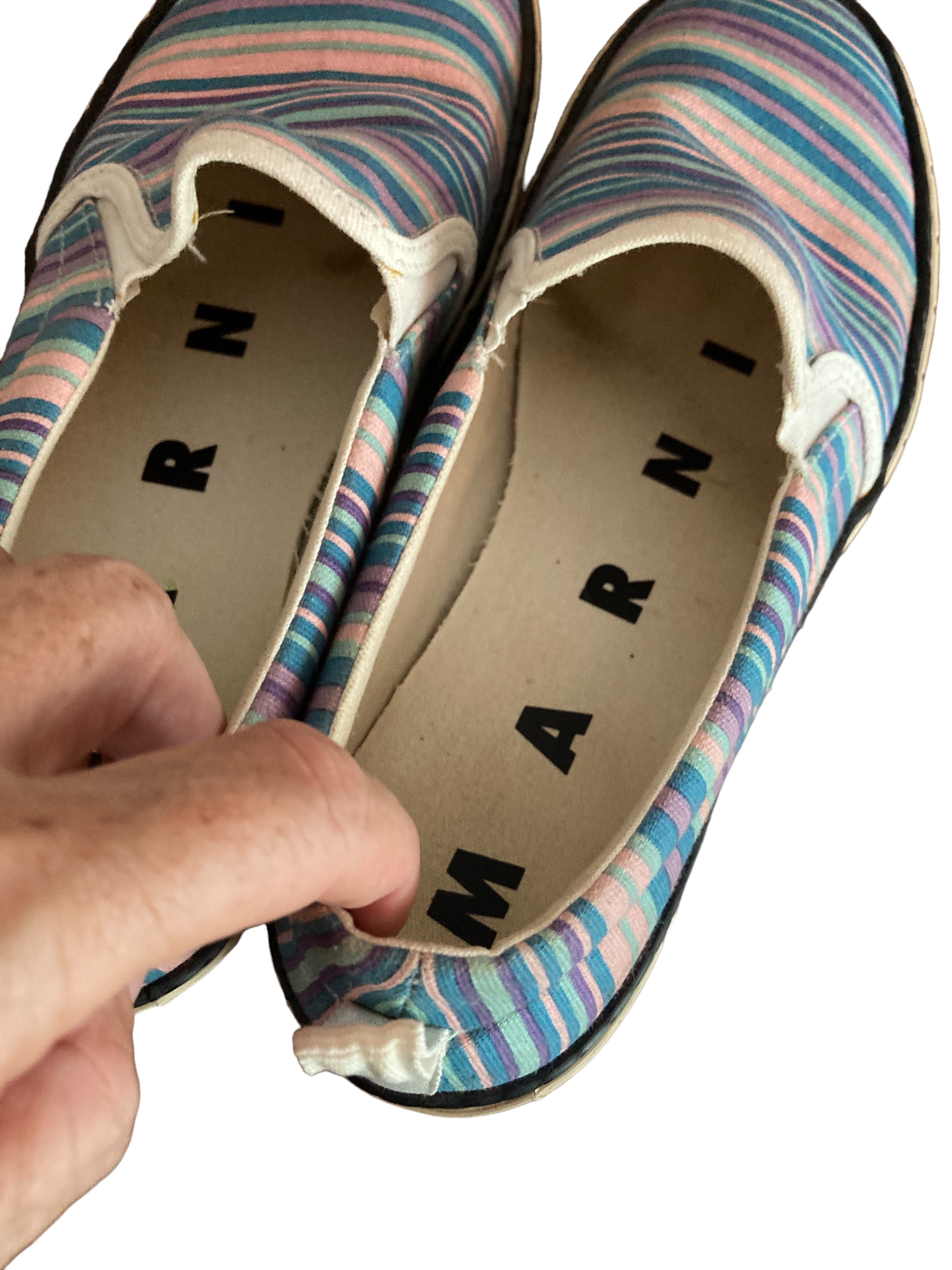 These comfy sneaks fit like a size 9. Rubber soles in very good condition-dark marks on the inside in the toe box at the top of the shoe, light fading on canvas.