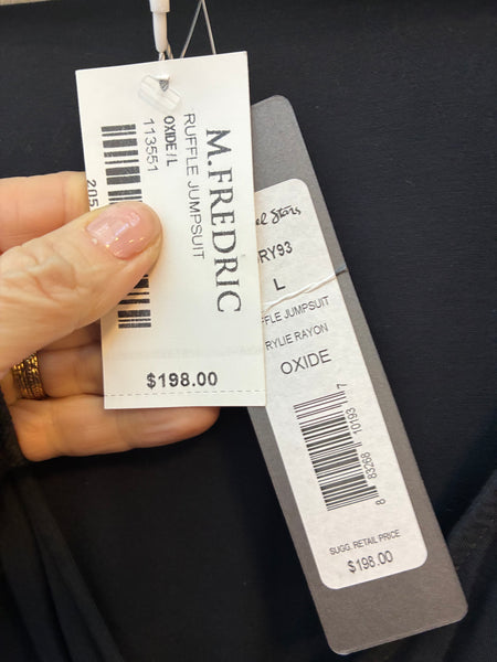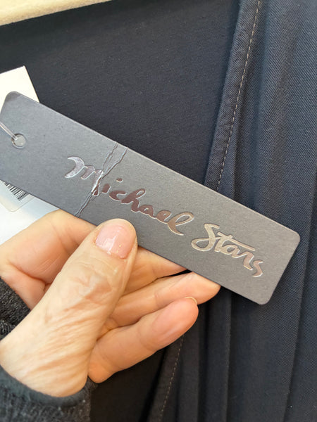 Stretches, with tags, short sleeve tulip sleeve, drapey jersey, pockets, crossover front with hook and eye closure. retail $198