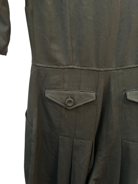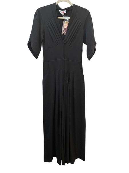 Black jumpsuit with tags. The short sleeves have an overlapping cut that is flattering on the arms, and there are covered buttons on the two back pockets. Another covered button on the front, with front and back pleats for drapey pants. Excellent preowned condition.