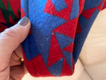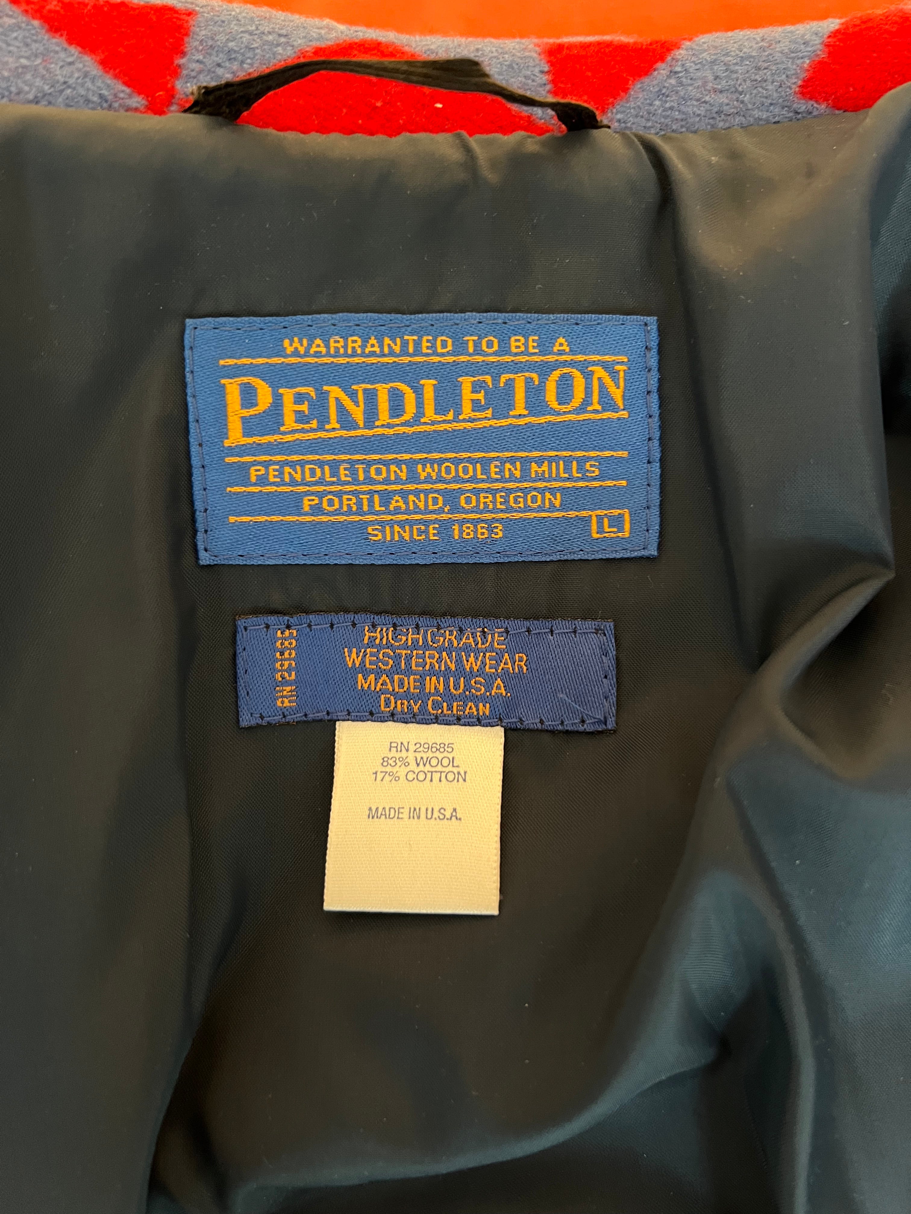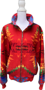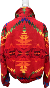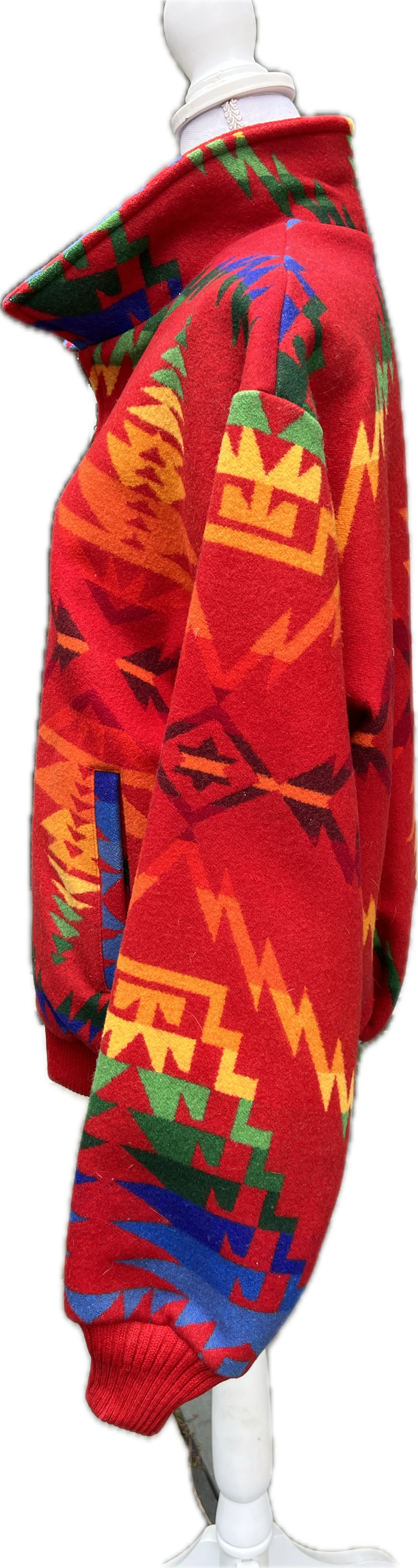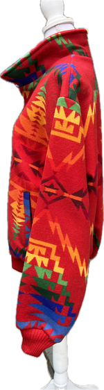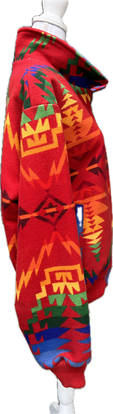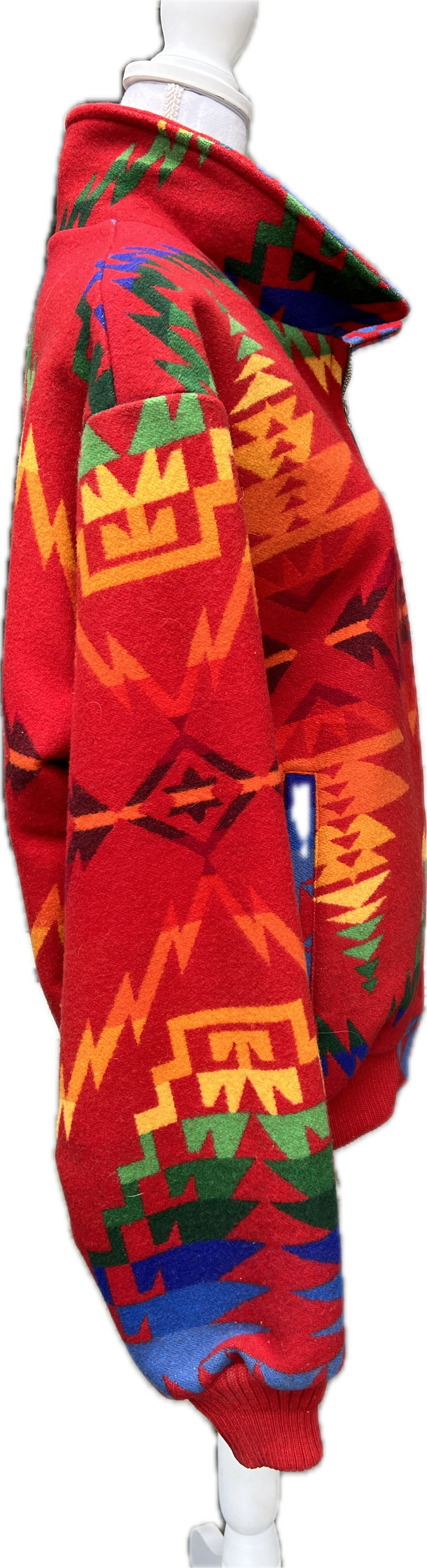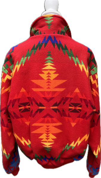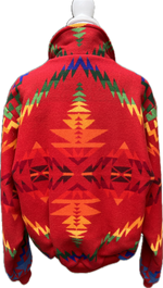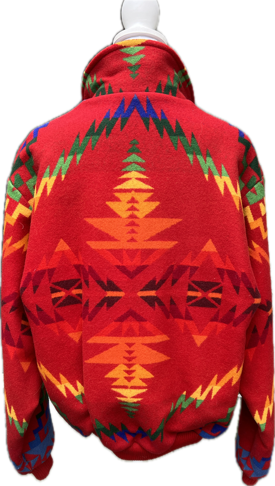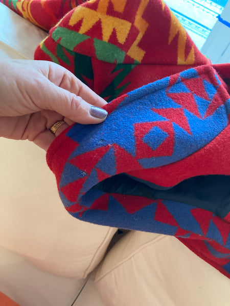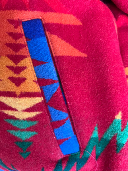 Popular Aztec style jacket in vibrant red and orange, from the classic Pendleton brand. Very good condition- there is some discoloration on the interior of each pocket. There are also a few minor marks on collar where the material is worn (last two pictures).