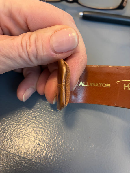 Adjustable alligator cuff made by Plato Kangis. New without tags. Peeling at both edges of the bracelet. Donated by the Kangis family.