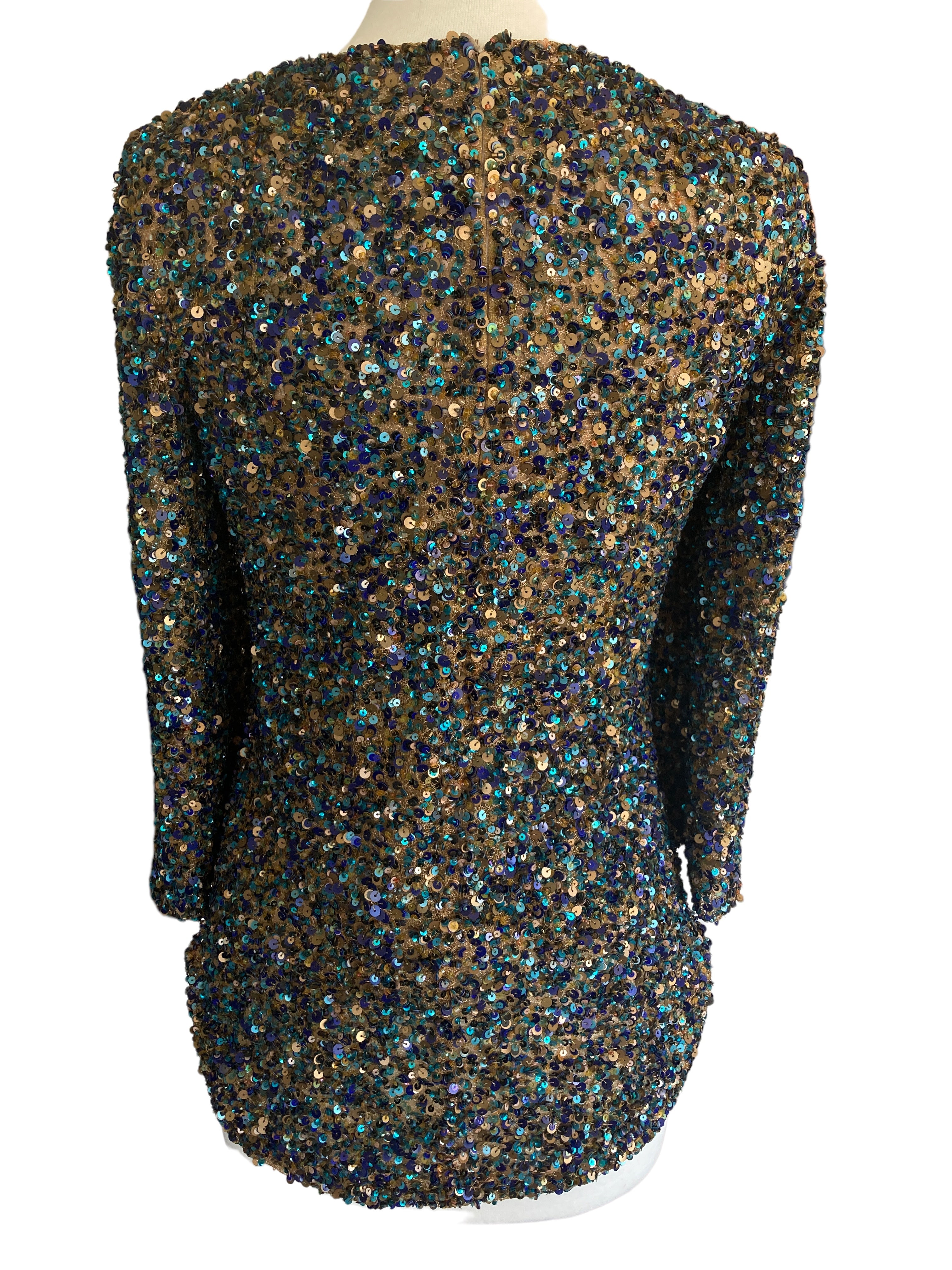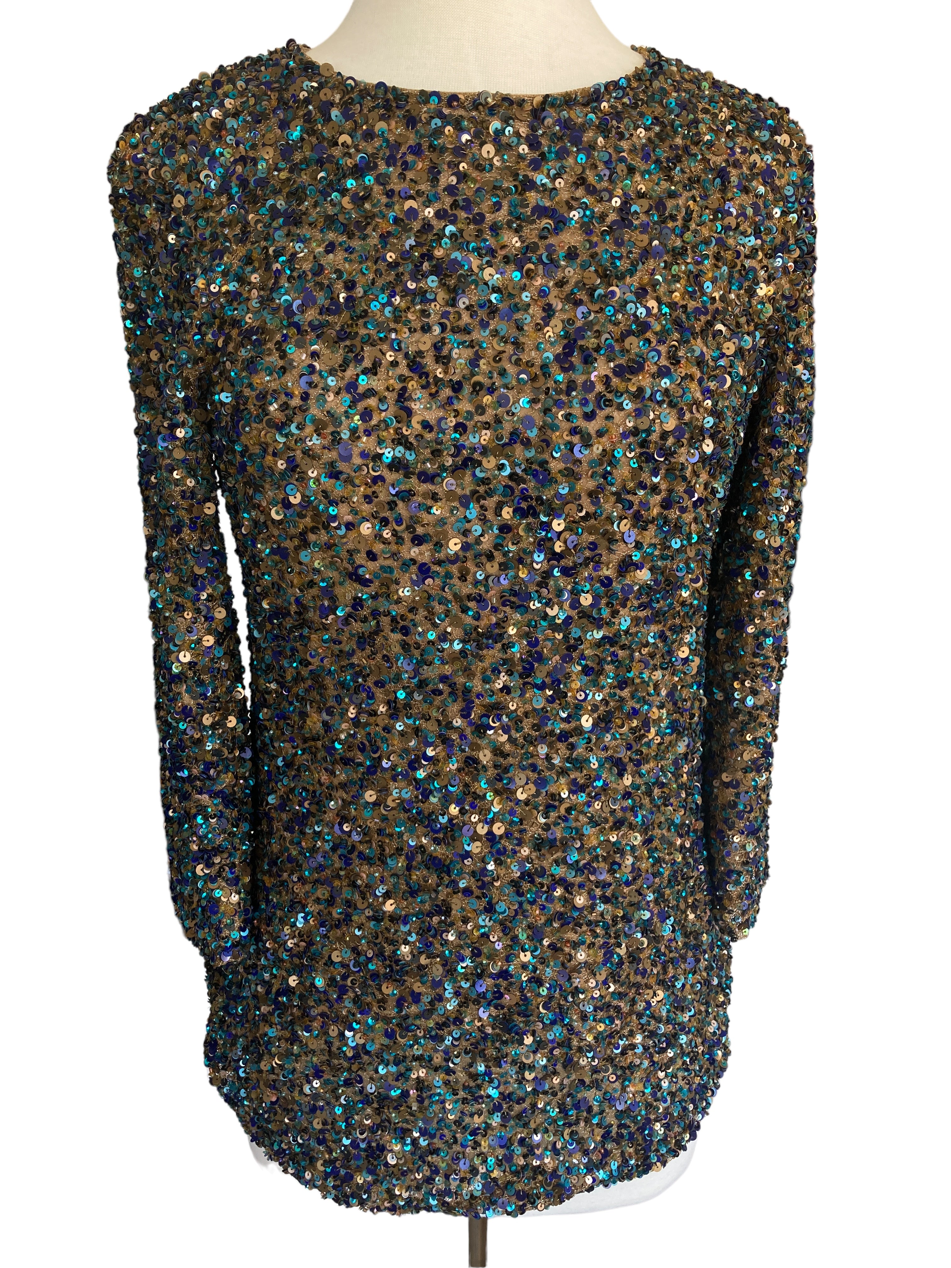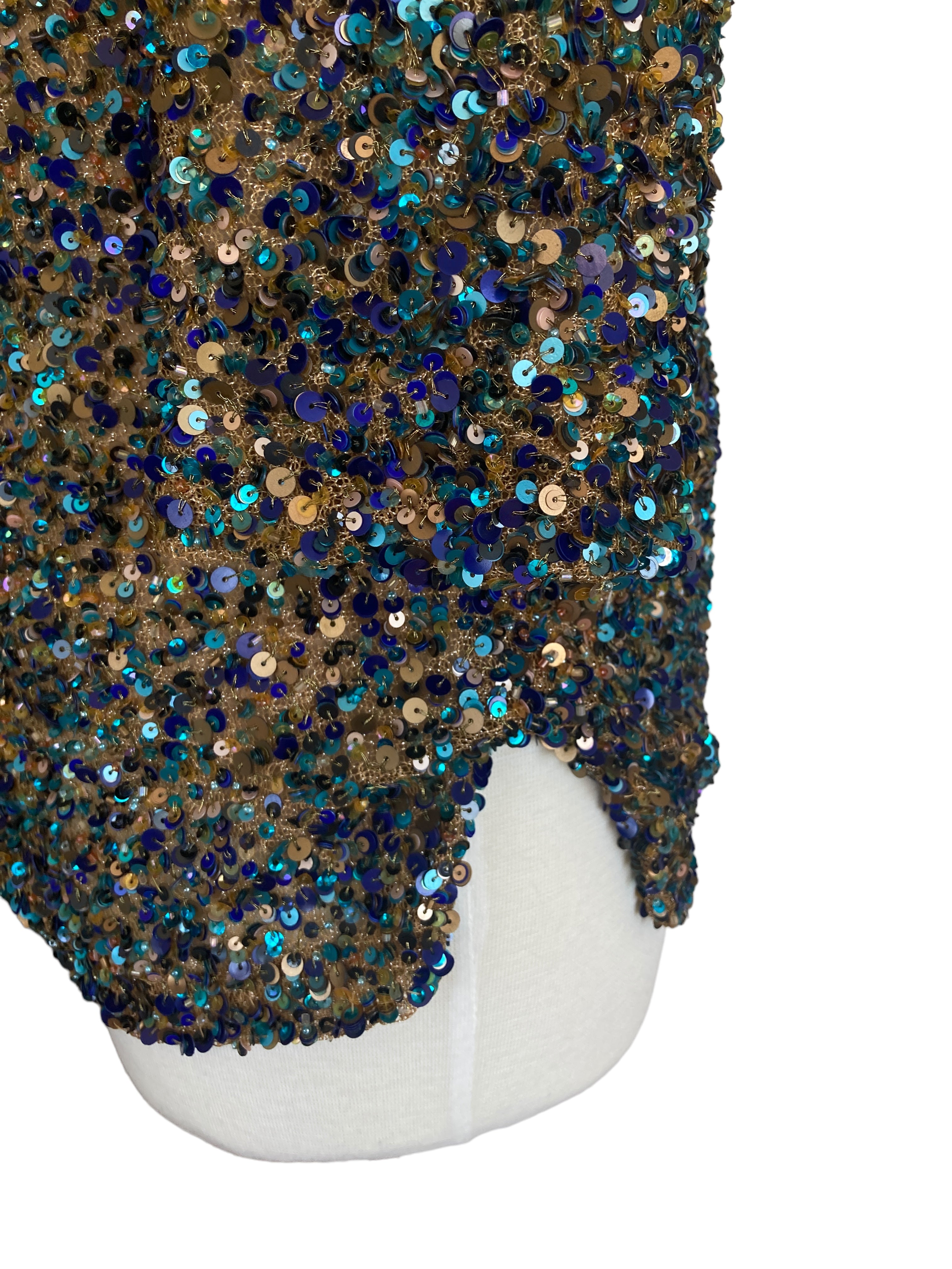 Beaded and sequins in gold, blue, and turquoise highlight this scoop neck. Lined. Concealed zip closure at the back. Lined. Fair condition. There are a few loose threads and missing sequins around the arm pits in particular (our Sewing Circle stabilized the area!). See the pictures- the flaws are obvious up close but because of the drape, not noticeable if your arms are down! Retail approx. $300.