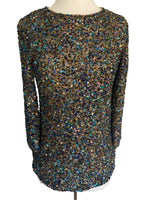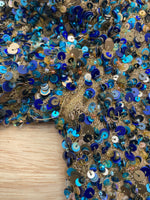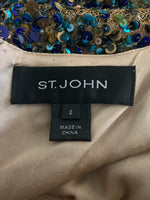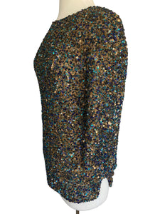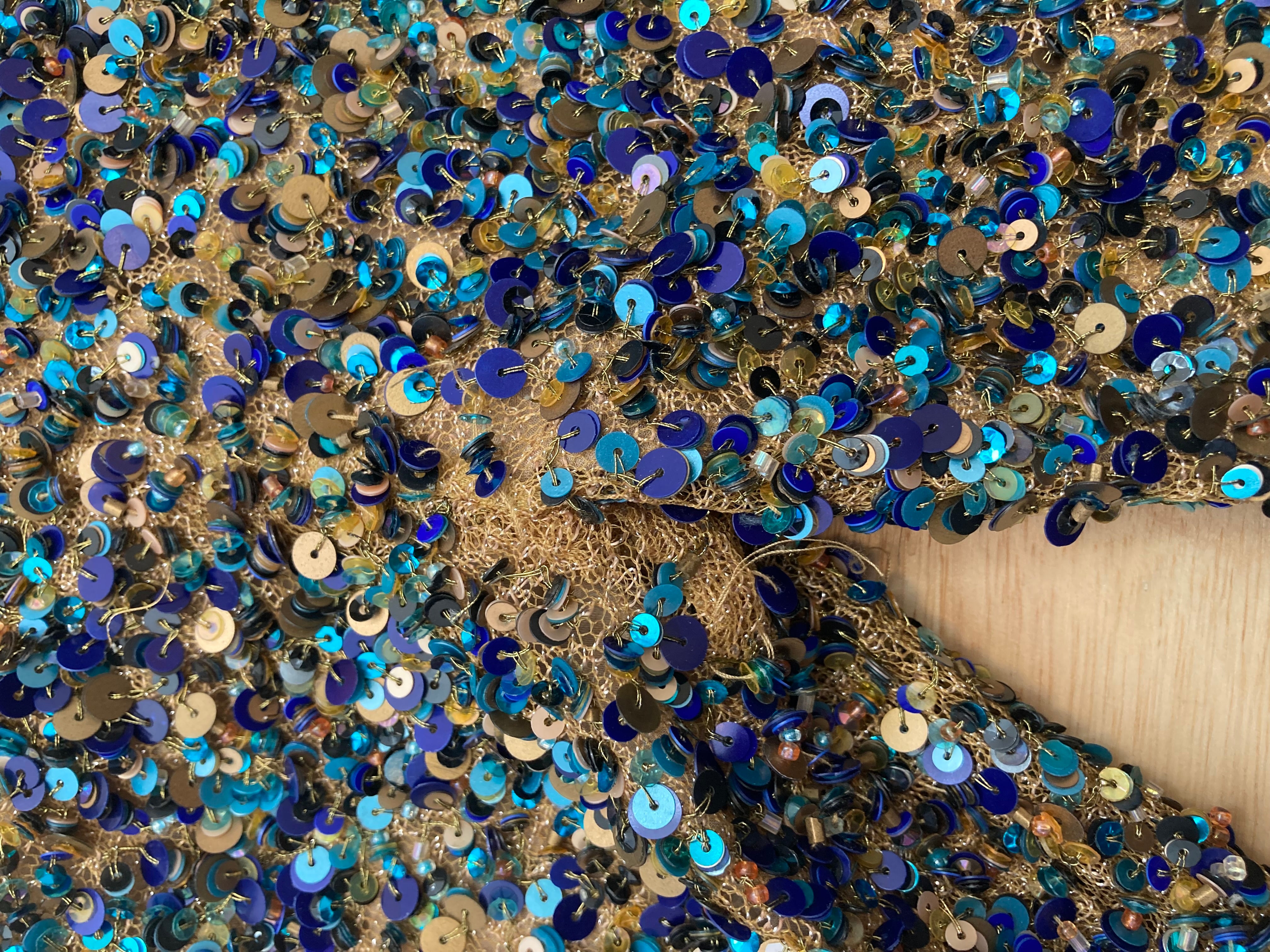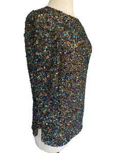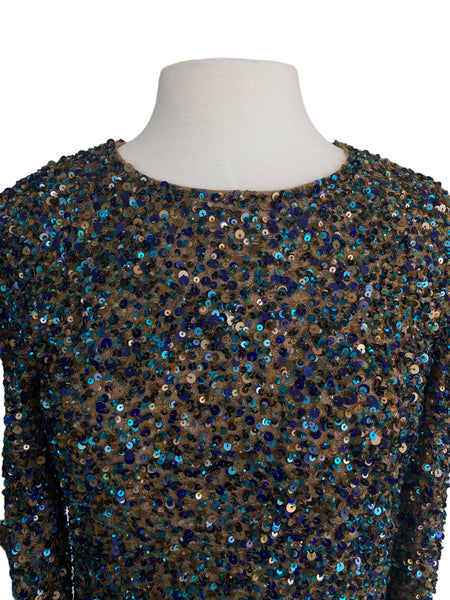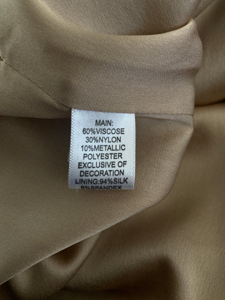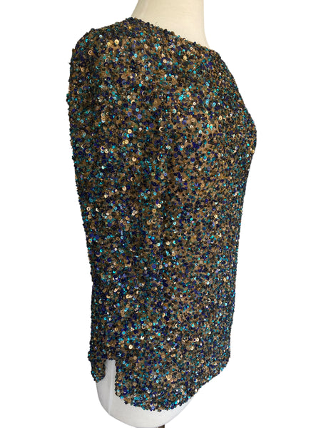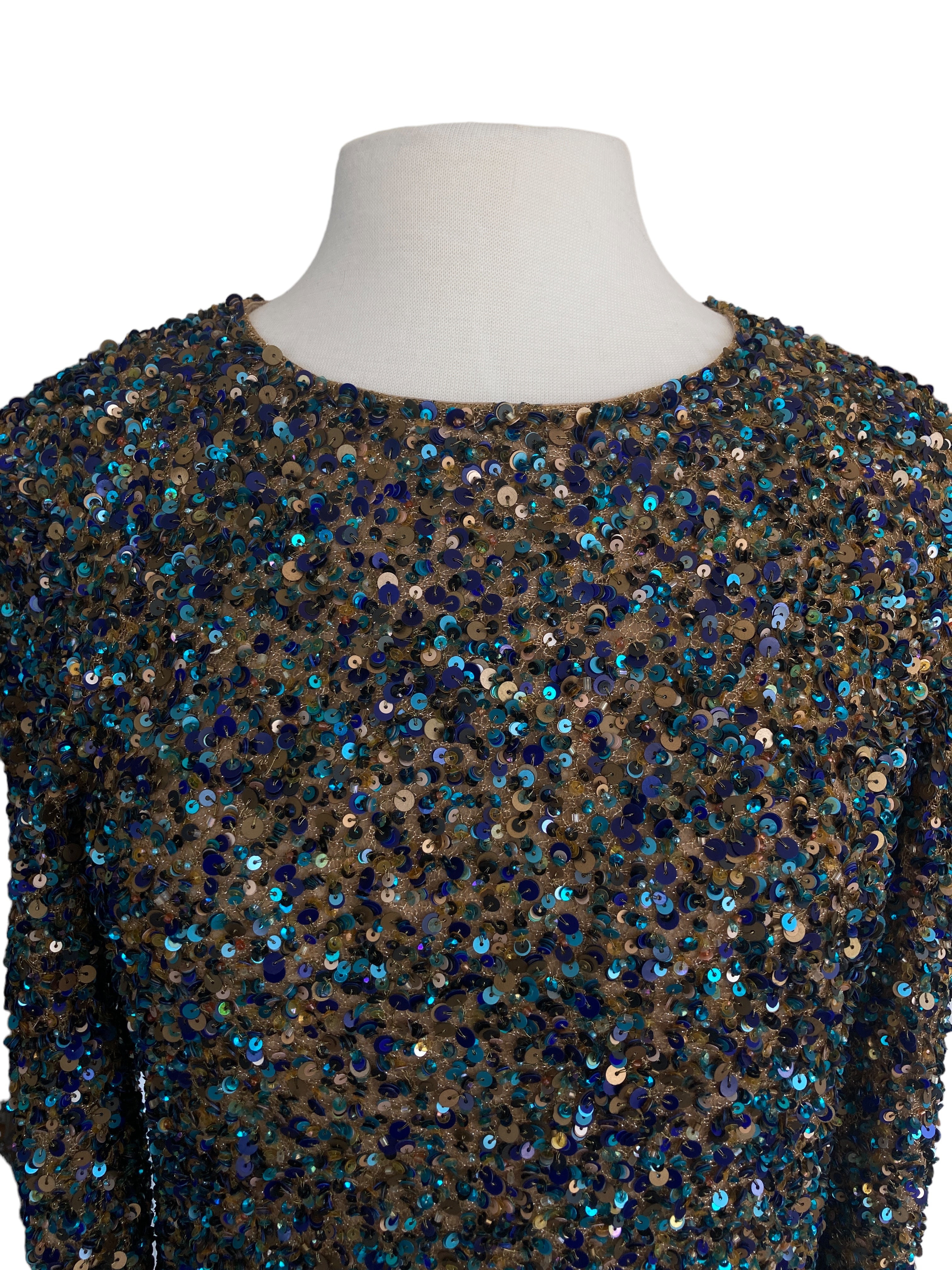 Beaded and sequins in gold, blue, and turquoise highlight this scoop neck. Lined. Concealed zip closure at the back. Lined. Fair condition. There are a few loose threads and missing sequins around the arm pits in particular (our Sewing Circle stabilized the area!). See the pictures- the flaws are obvious up close but because of the drape, not noticeable if your arms are down! Retail approx. $300.