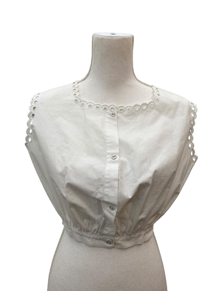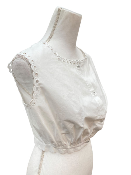 This sleeveless top is from the early 20th century, most likely it was worn as an undergarment but let's wear it as a crop top. Covered buttons secure the front. Gathered waist and eyelet trim on collar and shoulders. Excellent used condition with minor wear at waist button (see last pic).